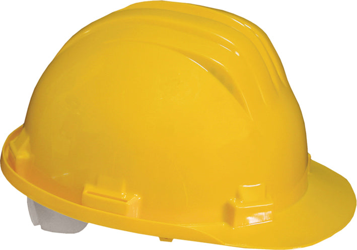 Elmetto protettivo giallo in plastica con bardatura interna regolabile e parasudore.