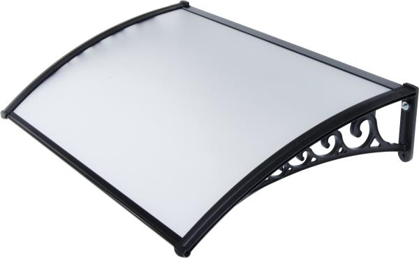 Braccetti in polipropilene rinforzato, profili in alluminio sia sulla parte frontale che sul retro. Modulabile ed estensibile lateralmente. Struttura colore nero e copertura in policarbonato compatto spessore mm 2,5 ca. Completa di accessori per assemblaggio e fissaggio