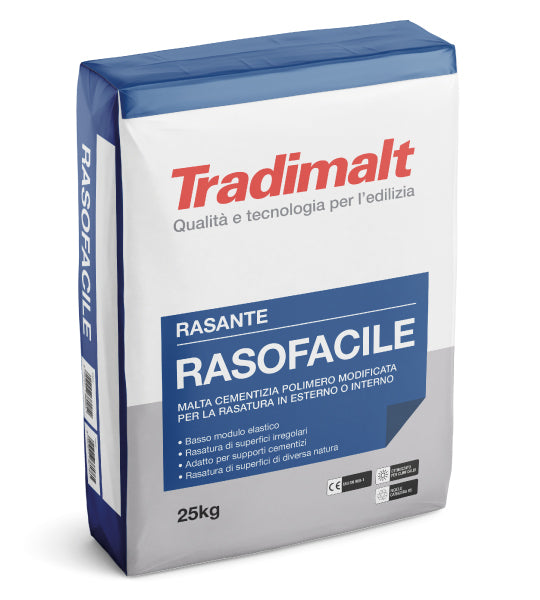 Malta cementizia polimero modificata per la rasatura di muri e pareti, in esterno o interno, adatta per supporti cementizi, indicata in genere per superfici irregolari anche se rivestite con prodotti sintetici.