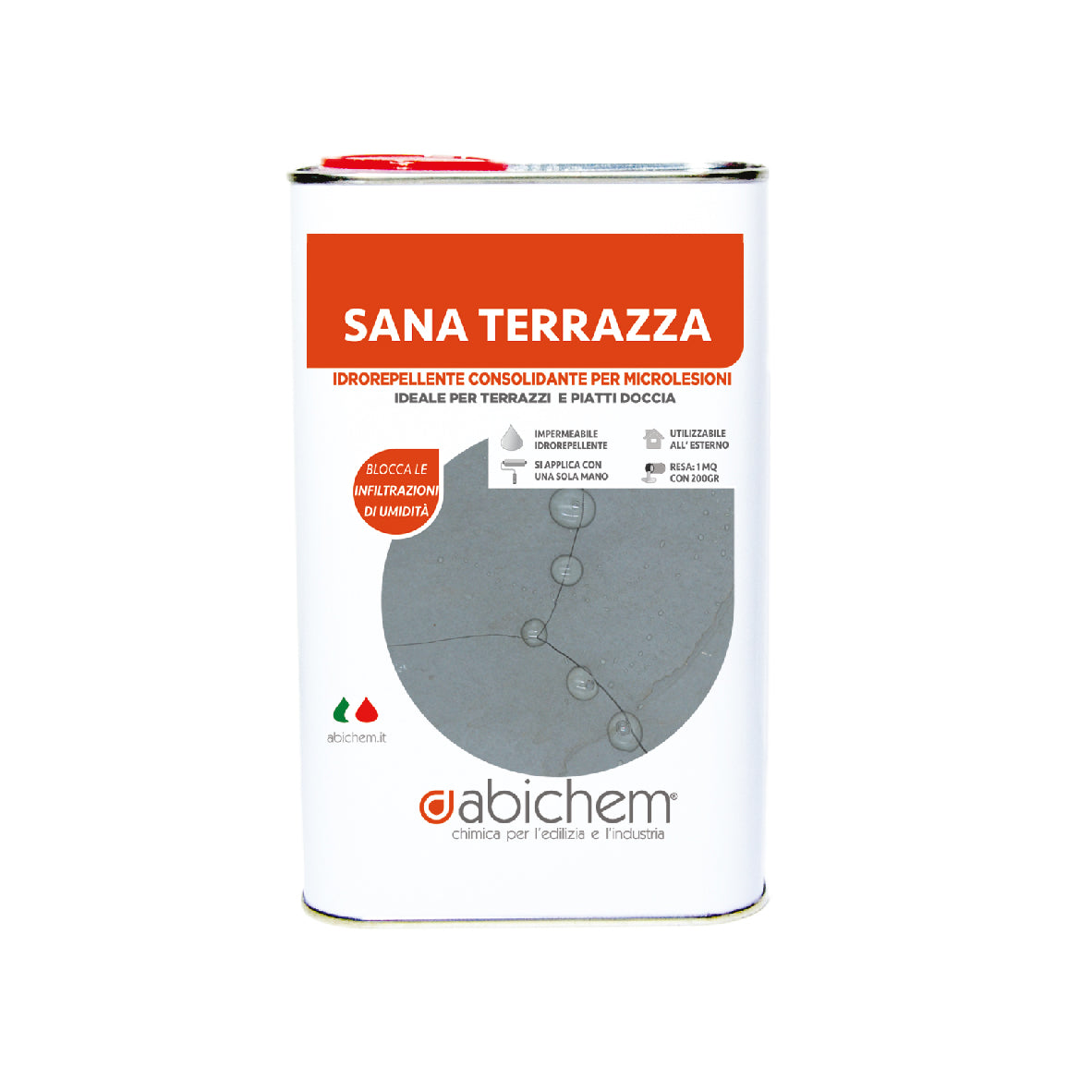 Proprietà: SANA TERRAZZA è un prodotto concepito per il ripristino di superfici orizzontali con microlesioni (terrazze e balconi). Caratterizzato da un'elevata capacità di penetrazione, ripara le cavillature attraverso un processo di consolidamento elastico (si adatta alle fessure), eliminando le infiltrazioni d'acqua, senza dover ricorrere a radicali rifacimenti. Rende le superfici trattate idrorepellenti. Per esterni. Diluizione: pronto all’ uso.