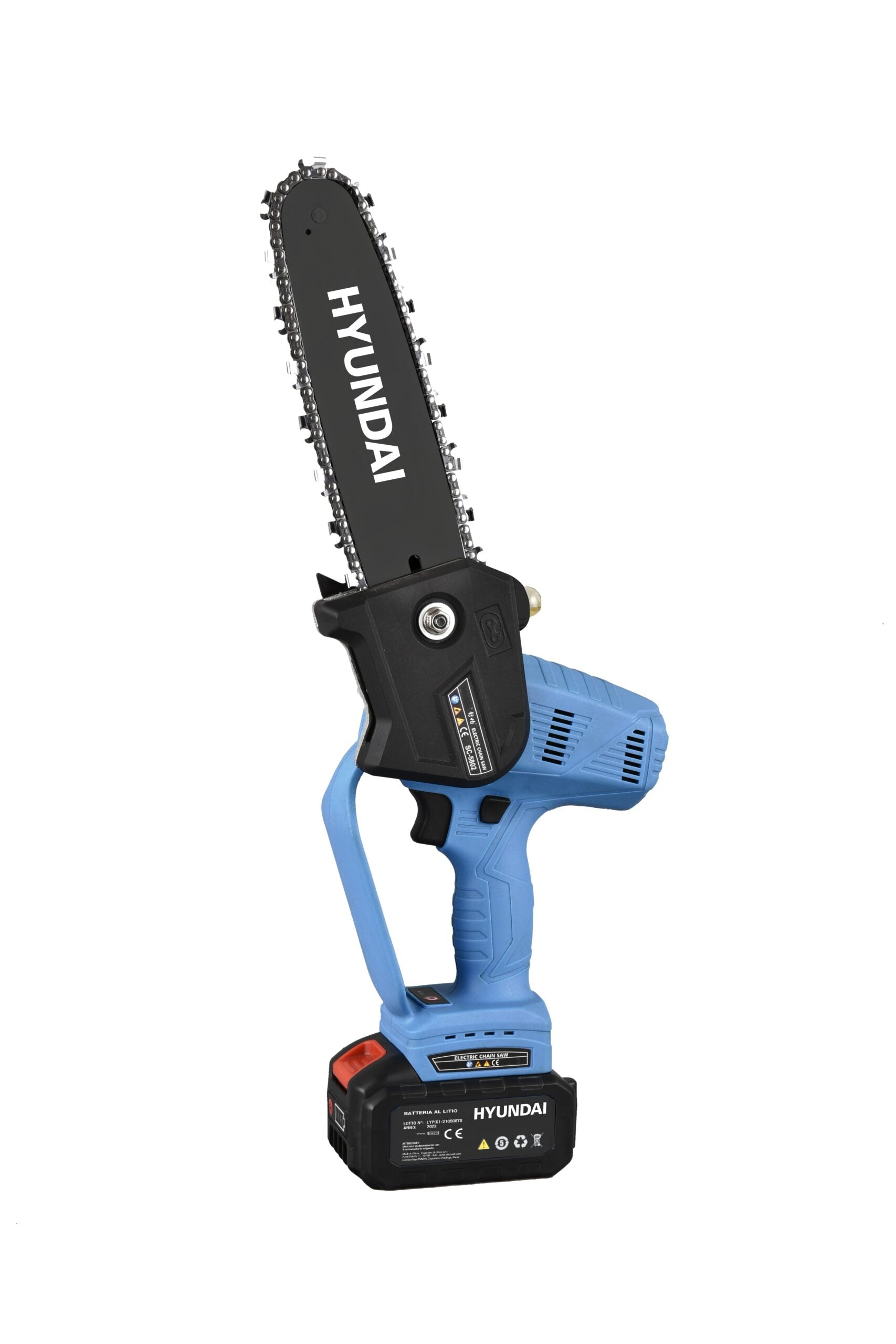 sega a batteria portatile Hyundai adatta per il taglio e la manutenzione di alberi e piante da giardino.