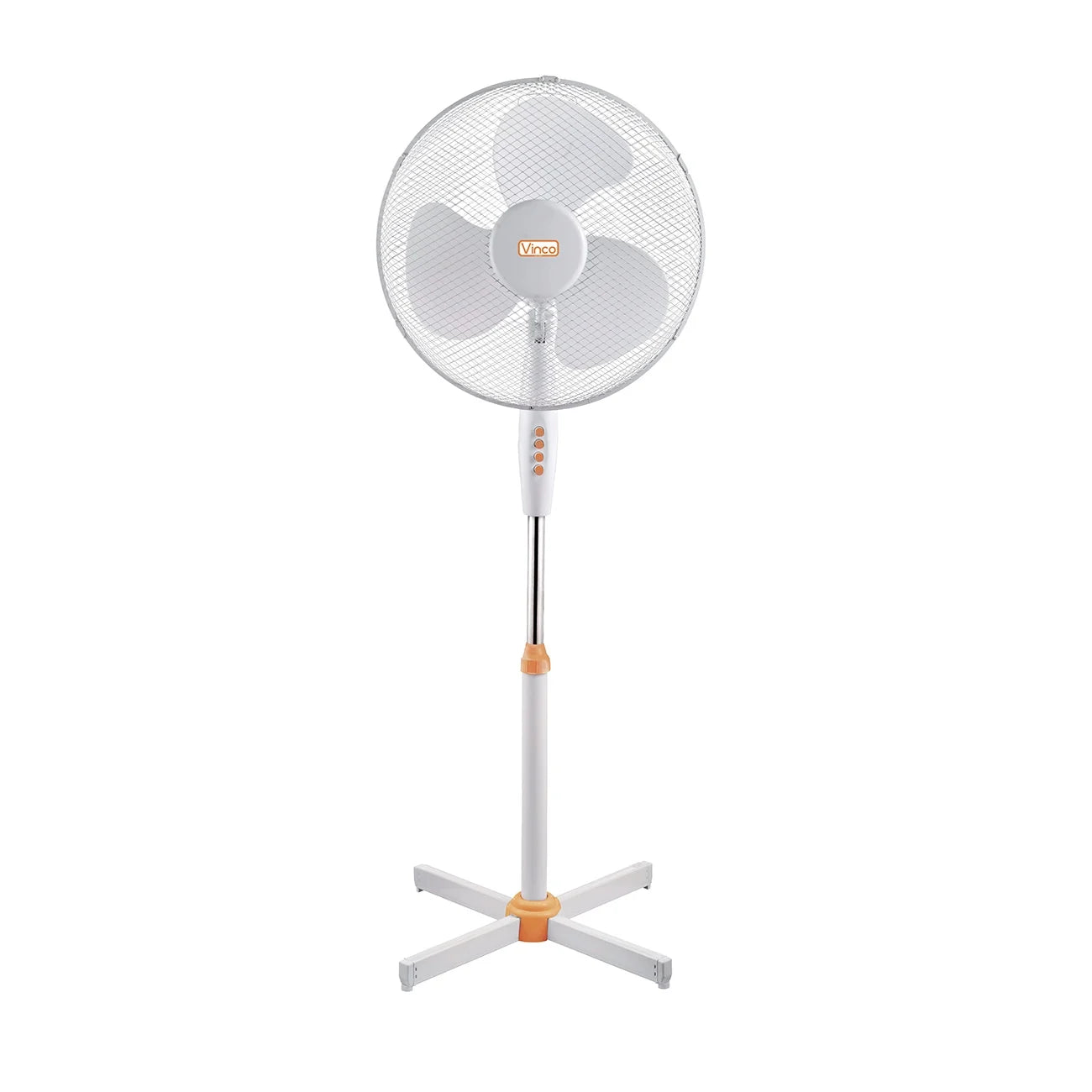 Ventilatore a piantana Vinco da 45W, base a crociera, altezza regolabile fino ad un massimo di 125 cm, 3 pale con diametro cm. 40. Colore bianco, griglia di copertura in metallo colore bianco, oscillazione laterale. Una soluzione per ambienti di lavoro e relax che permette massima flessibilità d’uso e flusso d’aria all’altezza desiderata. L’imballo contiene: 1 ventilatore